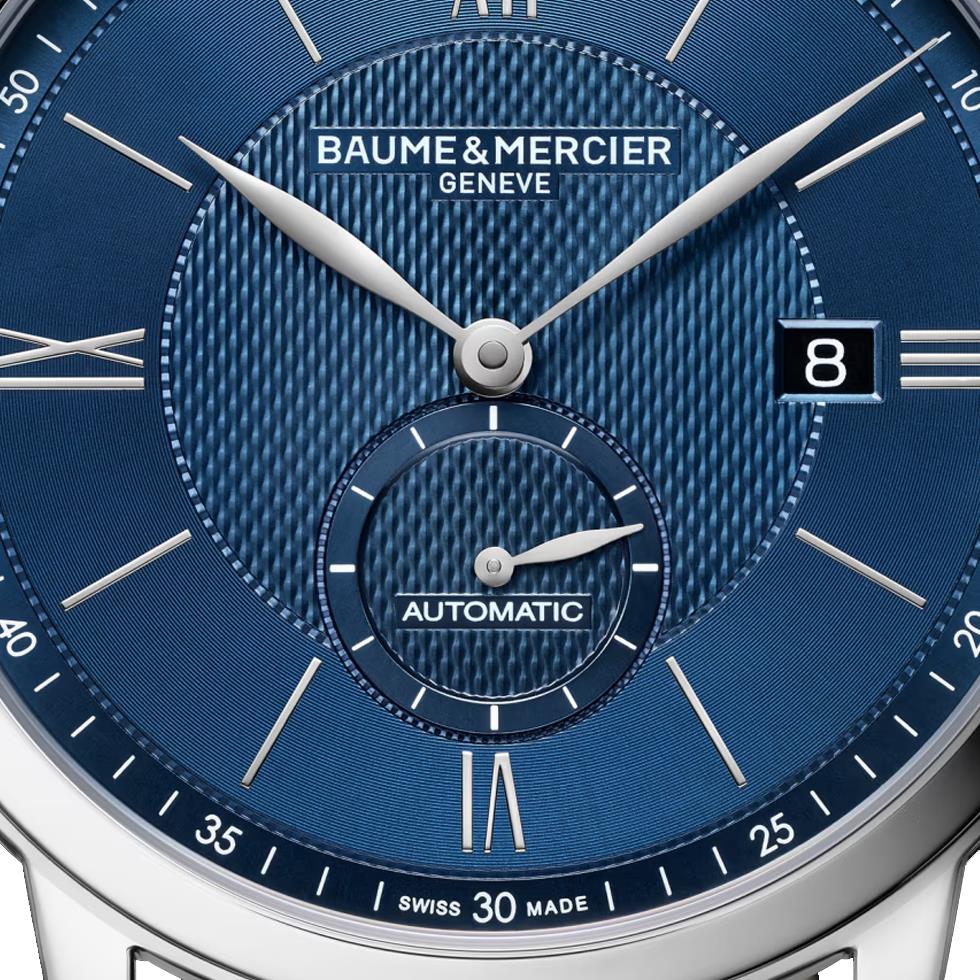Collezione principale, 42 mm. Movimento meccanico a carica automatica (Sellita SW 260-1) con piccoli secondi e data. Cassa in acciaio, quadrante blu e decoro guilloché grain d'orge, cinturino in alligatore nero.