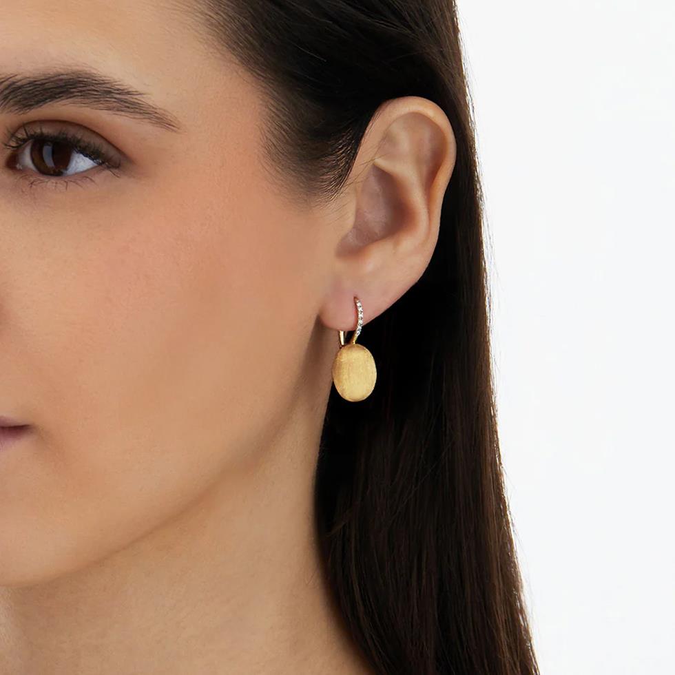 Eleganti orecchini in oro giallo e diamanti. La superfice dorata e irregolare, interamente incisa a mano dai nostri artigiani con uno speciale bulino millerighe, crea insieme ai diamanti un prodigioso gioco di luci da abbinare ad un look tanto elegante quanto casual.